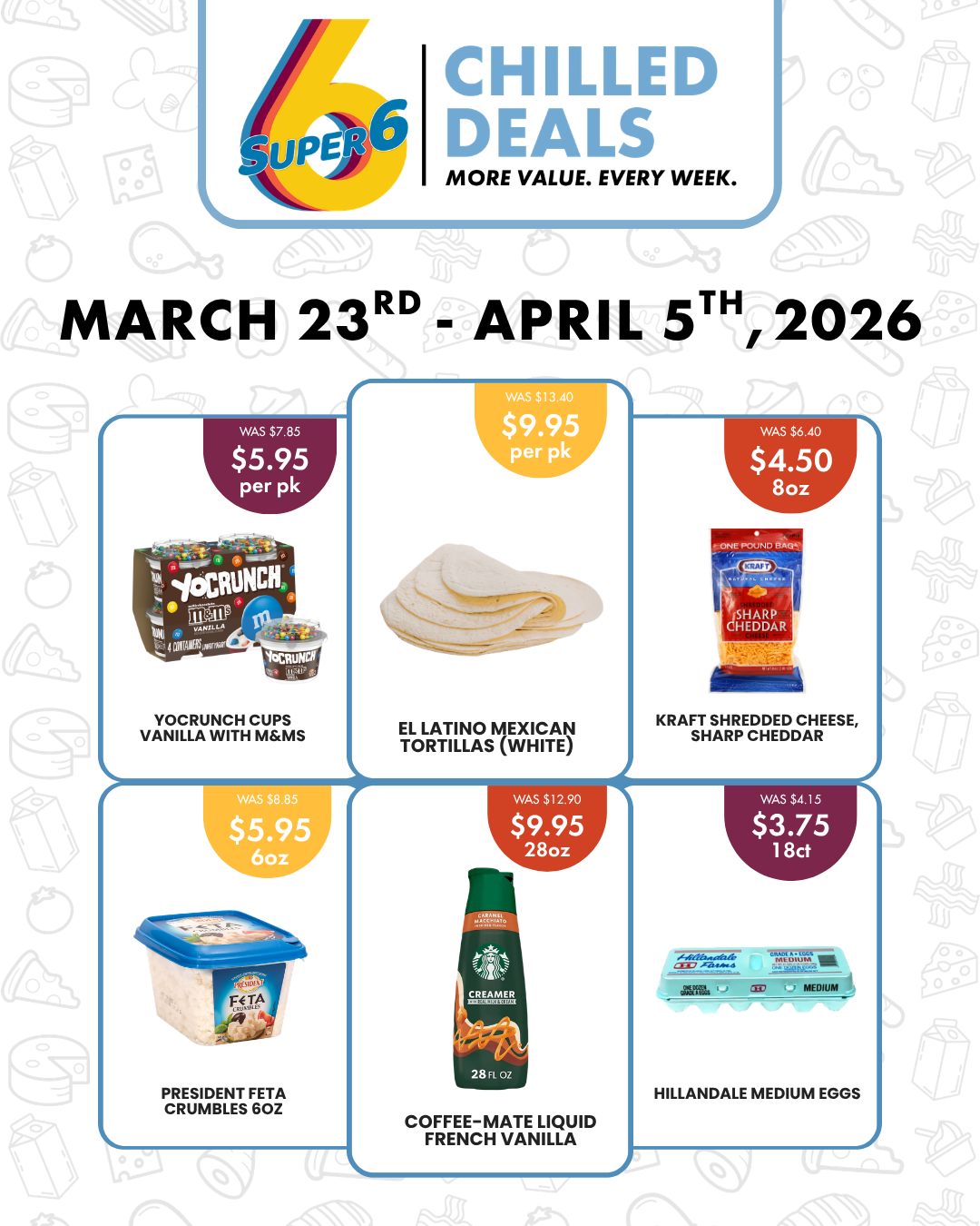 Discover more value on the chilled essentials you rely on. Super 6 Chilled Deals features six premium products at unbeatable prices, giving you quality and savings every time you shop. From fresh milk, eggs, and butter to a variety of cheeses, yogurt, and juices — there’s always something for your everyday needs.
